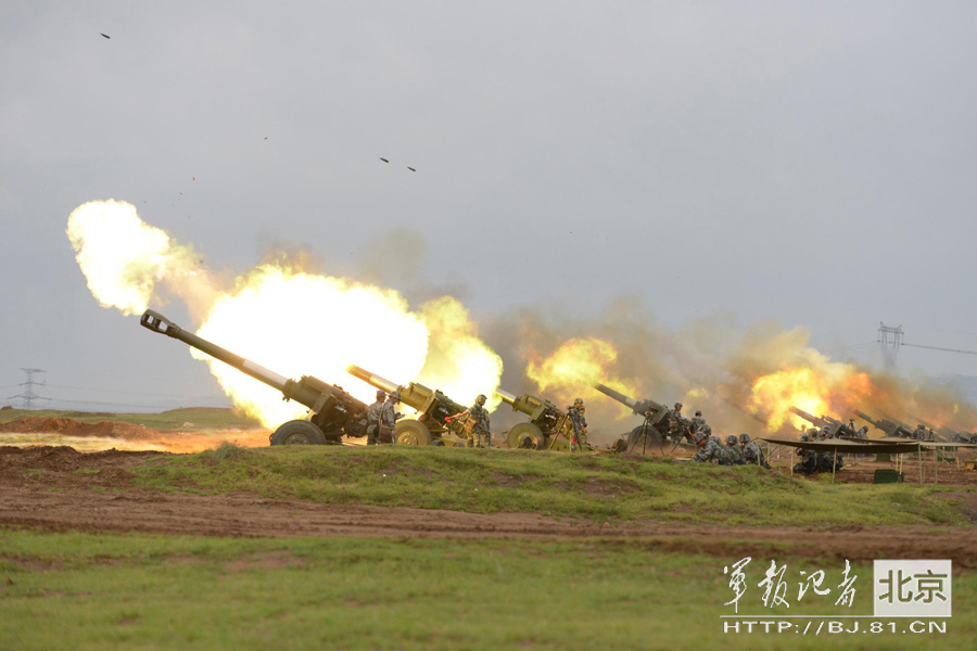 In this autumn, a field artillery brigade of the 27th Group Army of the PLA maneuvers from northwest China to the beach of the Bohai Sea to conduct a live-fire drill and successfully hit a dozen of mobile targets on the sea. (BJ.81.cn/Chang Tianlong)