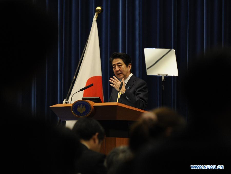 Japanese Prime Minister Shinzo Abe speaks during a press conference at his official residence in Tokyo, Japan, Nov. 21, 2014. Japan dissolved the House of Representatives, or the lower house in its bicameral parliament, on Friday for a general election slated for Dec. 14, with Prime Minister Shinzo Abe's economic policies dubbed "Abenomics" and other polices to be tested in the looming vote. (Xinhua/Stringer)