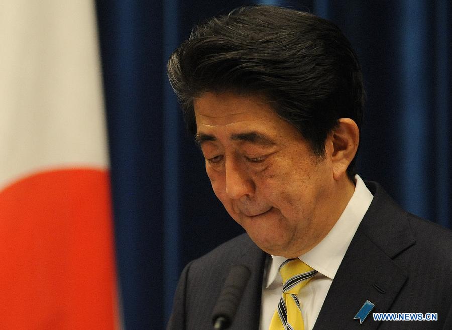 | Japanese Prime Minister Shinzo Abe bites his lips during a press conference at his official residence in Tokyo, Japan, Nov. 21, 2014. Japan dissolved the House of Representatives, or the lower house in its bicameral parliament, on Friday for a general election slated for Dec. 14, with Prime Minister Shinzo Abe's economic policies dubbed "Abenomics" and other polices to be tested in the looming vote. (Xinhua/Stringer) |