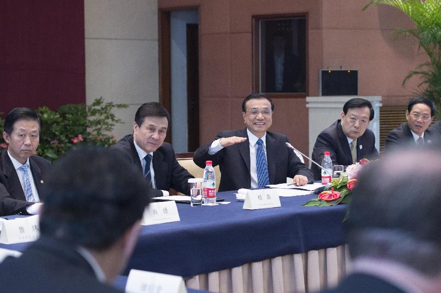 Chinese Premier Li Keqiang (C rear) speaks during his meeting with representatives attending the World Internet Conference, in Hangzhou, capital of east China's Zhejiang Province, Nov. 20, 2014. (Xinhua/Wang Ye)
