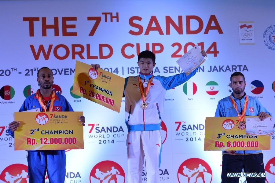 Li Shen (C) of China, Sentwali Kofie woolridge (L) of Bermuda and Achraf Haddadi (R) of Tunisia pose for a group photo during the awarding ceremony of the Men's Sanda-70kg during the 7th Sanda World Cup in Jakarta, Indonesia, Nov. 21, 2014. Li Shen won the gold medal, Sentwali Kofie woolridge won the silver and Achraf Haddadi won the bronze. (Xinhua/Zulkarnain)
