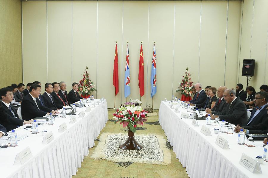Visiting Chinese President Xi Jinping (2nd L) meets with his Fijian counterpart Epeli Nailatikau (2nd R) in Nadi, Fiji, Nov. 21, 2014. (Xinhua/Rao Aimin)