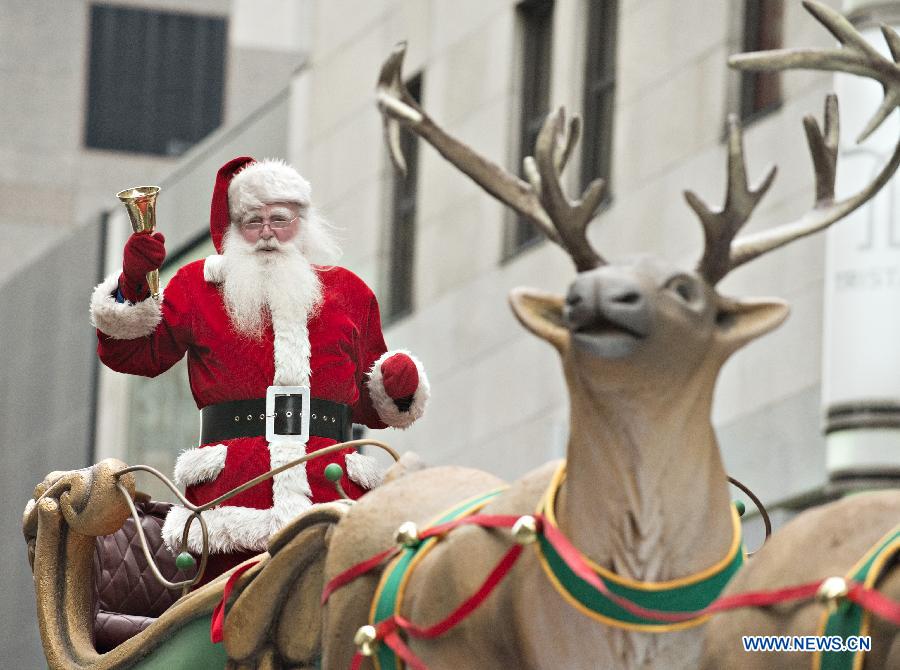 Montreal's annual Santa Claus parade is held in Montreal's downtown core on Nov. 22, 2014. There are more than 1,000 performers including acrobats, dancers and clowns on various floats and marching bands in the second largest Santa Claus parade in Canada. (Xinhua/Andrew Soong)