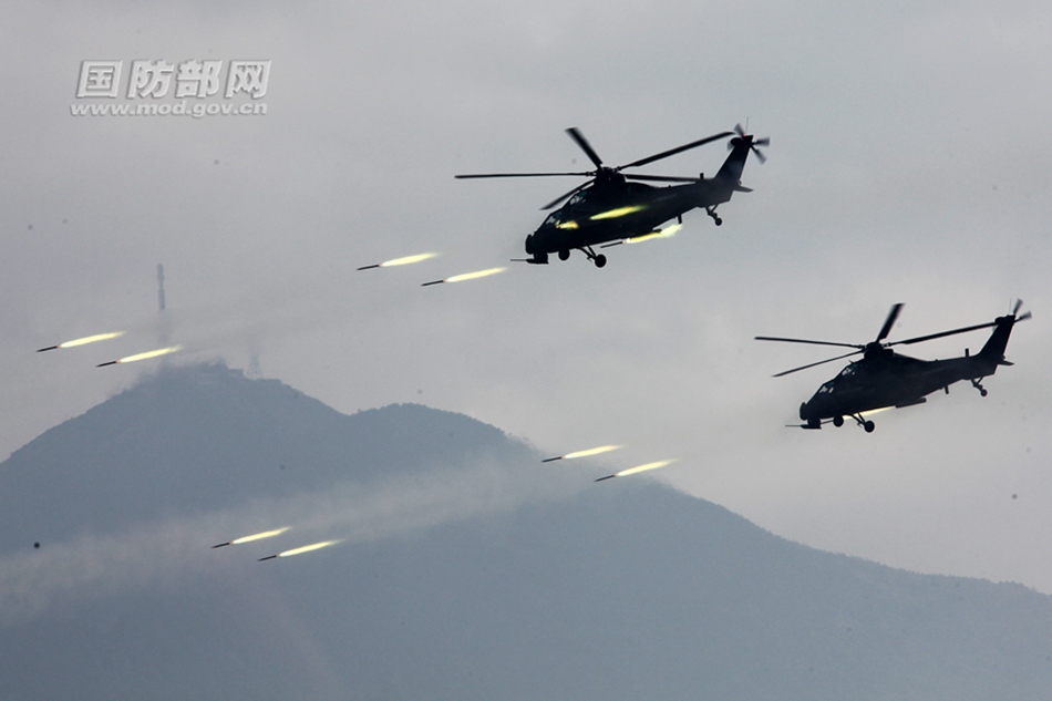 A new-type armed helicopter fires at "enemy" in a military drill on Nov. 20, 2014. (Mod.gov.cn/Wu Da)
