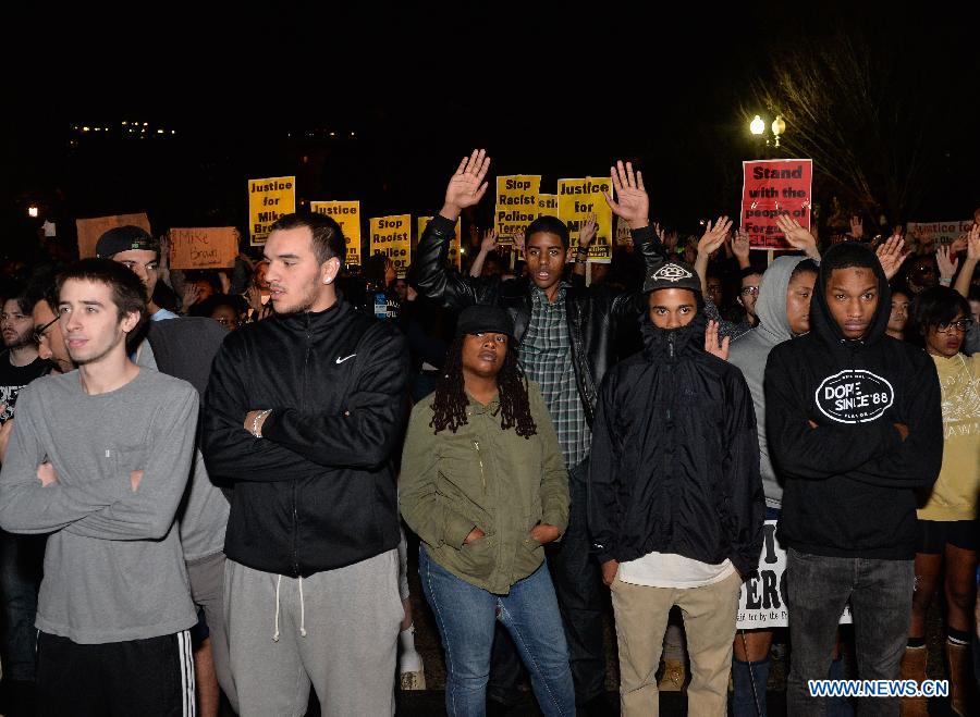 People protest against the grand jury's decision not to charge police officer Darren Wilson in the fatal shooting of African American youth Michael Brown in Ferguson in August, in front of the White House in Washington D.C., the United States, Nov. 24, 2014. More than 200 people took part in the protest in front of the White House on Monday. (Xinhua/Bao Dandan)