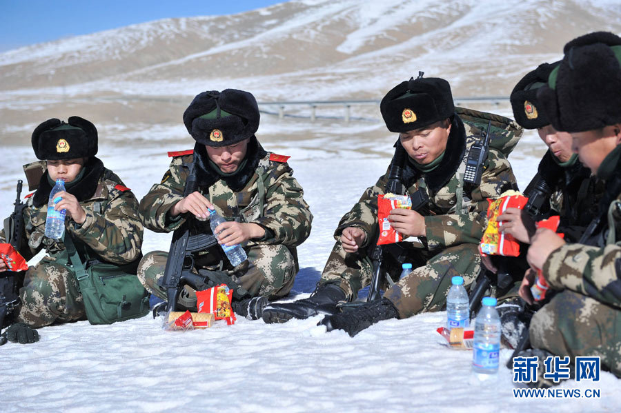 The patrolling soldiers sit down to have a meal. (Xinhua/Ma Ding)