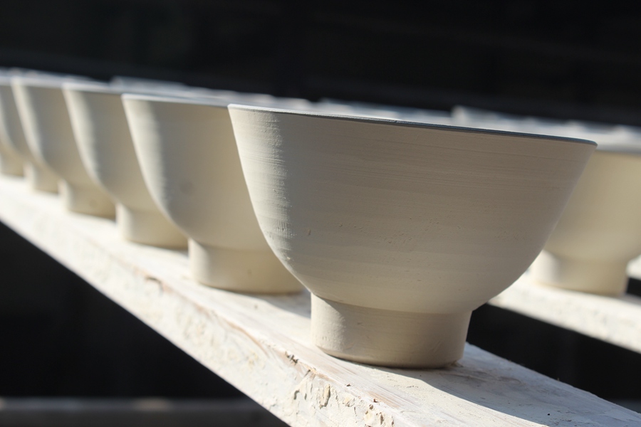Unfinished porcelain is put under the sun to dry before put into the kiln, at the Jingdezhen Ancient Kilns in Jingdezhen city, Jiangxi province on Nov. 18, 2014. (Photo/People's Daily Online)
