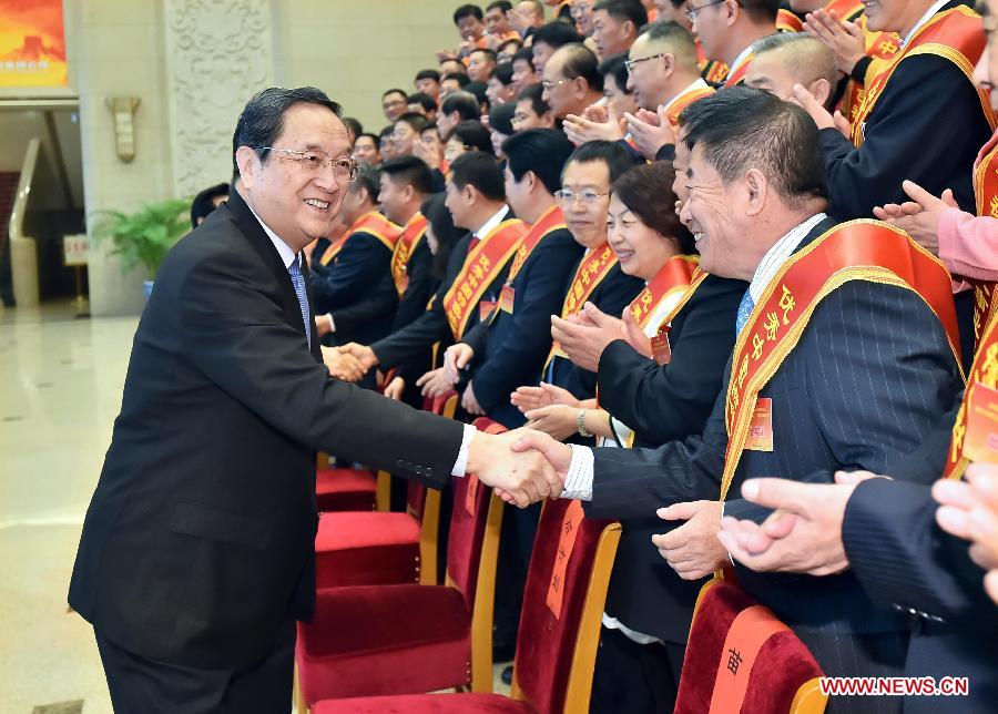 | Yu Zhengsheng, chairman of the National Committee of the Chinese People's Political Consultative Conference (CPPCC), meets with representatives attending an awards ceremony for 100 outstanding figures in the private sector in Beijing, capital of China, Nov. 25, 2014. An awards ceremony for 100 outstanding figures in the private sector was held in Beijing Tuesday. (Xinhua/Li Tao) |