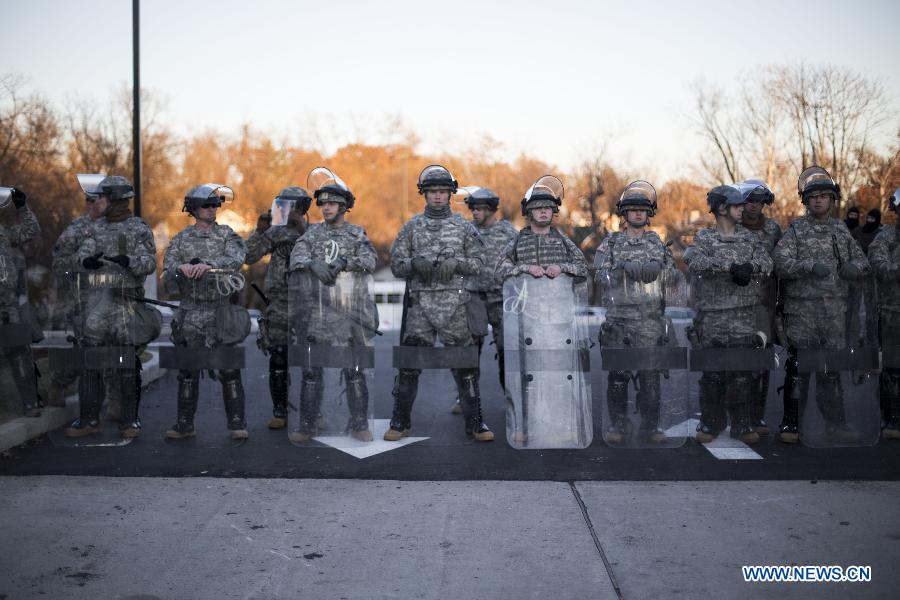 U.S. National Guard stand guard outside of Ferguson Police Department in Ferguson, Missouri, the United States, on Nov. 26, 2014. Missouri Governor Jay Nixon has called in more National Guards to control the situation. Some 2,200 National Guards have been deployed in Ferguson by Wednesday. (Xinhua/Jim Vondruska)
