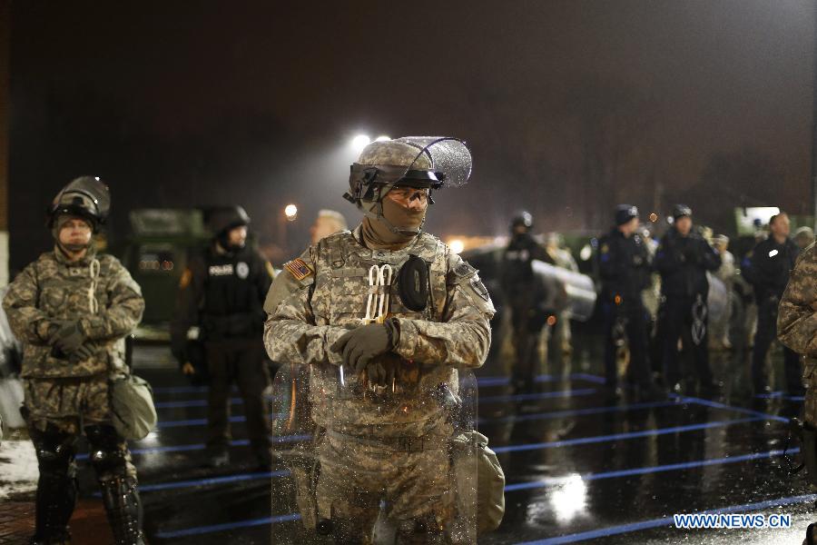 U.S. national guardsmen stand guard outside the Ferguson Police Department, in Ferguson, Missouri, the United States, on Nov. 26, 2014. Missouri Governor Jay Nixon has called in more National Guards to control the situation. Some 2,200 National Guards have been deployed in Ferguson by Wednesday. (Xinhua/Jim Vondruska)