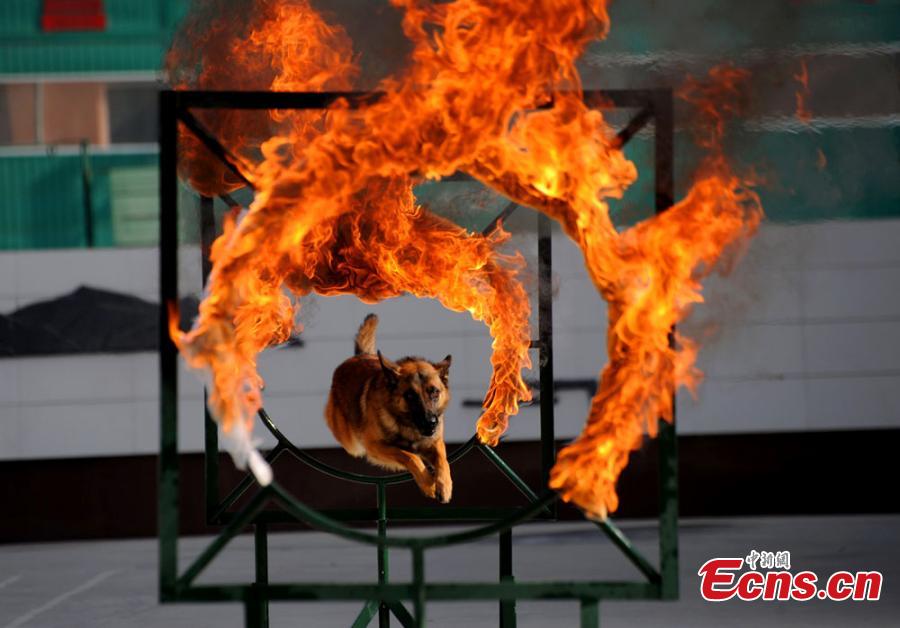 A rescue dog of a fire brigade jumps through a flaming hoop during a training program in Northwest China’s Gansu province. [Photo: China News Service/ Shi Yonghong]