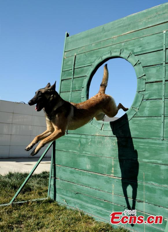 | A rescue dog of a fire brigade crosses the barriers during a training program in Northwest China’s Gansu province. [Photo: China News Service/ Shi Yonghong] |
