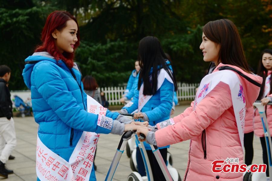 School beauties from over 20 Chinese universities ride two-wheeled scooters during a competition in Changsha, Hunan province on November 26, 2014. The event was held to promote low-carbon choices of transportation. [Photo/ Yang Huafeng]