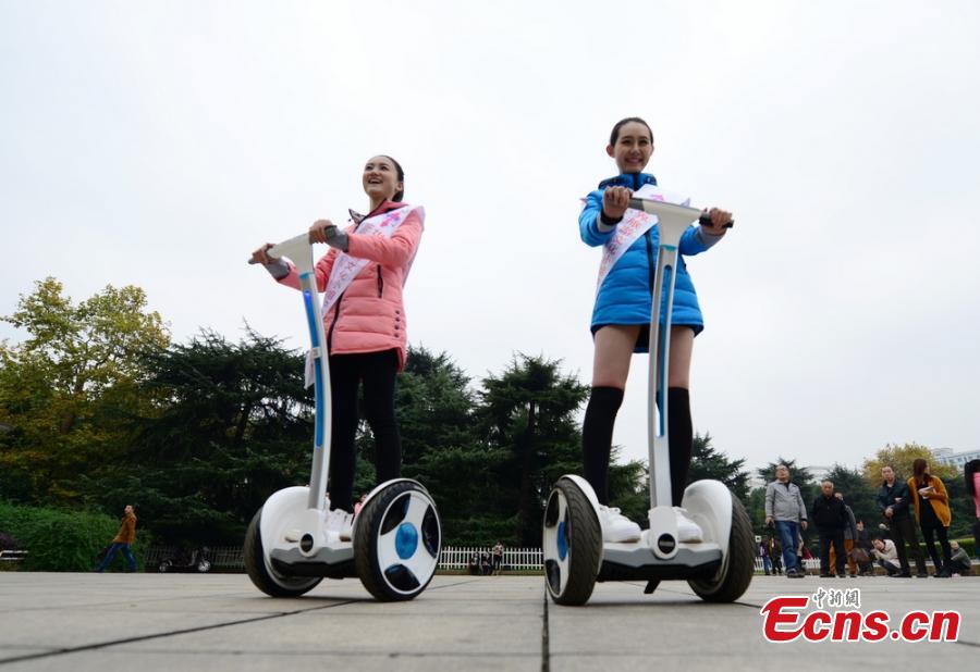 School beauties from over 20 Chinese universities ride two-wheeled scooters during a competition in Changsha, Hunan province on November 26, 2014. The event was held to promote low-carbon choices of transportation. [Photo/ Yang Huafeng]