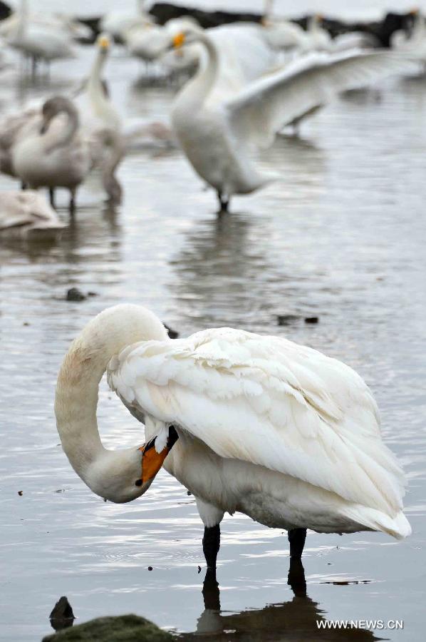 Swans preen their feathers on a lake in Rongcheng, east China's Shandong Province, Nov. 28, 2014. Several tens of thousands of swans migrating from Siberia converged in Rongcheng to pass the winter recently. (Xinhua/Guo Xulei)