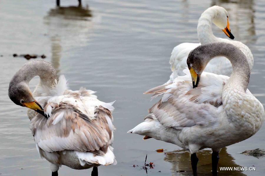 Swans preen their feathers on a lake in Rongcheng, east China's Shandong Province, Nov. 28, 2014. Several tens of thousands of swans migrating from Siberia converged in Rongcheng to pass the winter recently. (Xinhua/Guo Xulei)