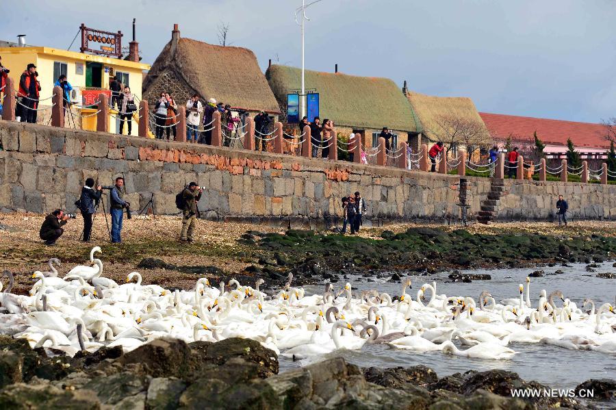 Tourists take photos of swans in Rongcheng, east China's Shandong Province, Nov. 28, 2014. Several tens of thousands of swans migrating from Siberia converged in Rongcheng to pass the winter recently. (Xinhua/Guo Xulei)