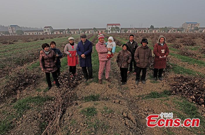 A family who relocated from Wushan county to Jizhou pose for photos in the field on December 21, 2013. [Photo/Li Feng]