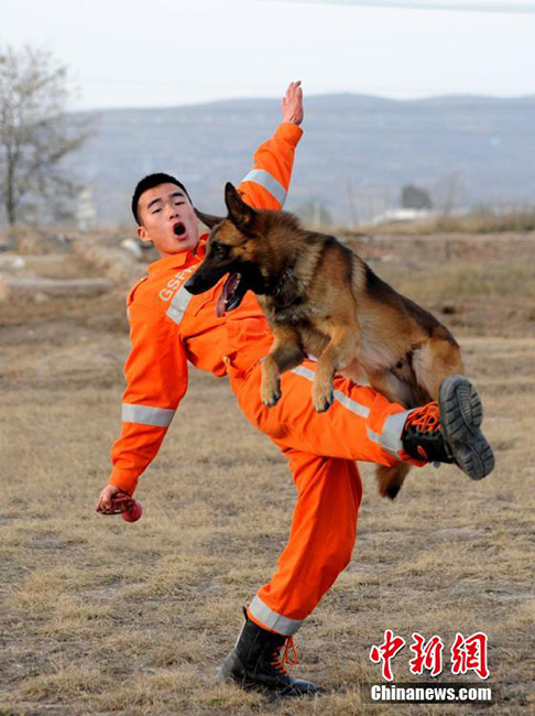 The fireman and his rescue dogs. (CNS/Shi Yonghong)