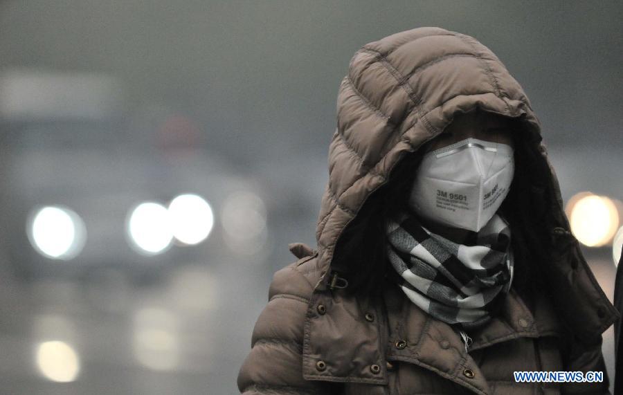 A pedestrian wears a facial mask respirator against heavy smog in Beijing, capital of China, Nov. 29, 2014. China's capital city was again caught in a heavy smog on Saturday. Beijing's municipal air pollution control authorities recorded an AQI (air quality index) reading of 300, which denotes very unhealthy air quality. (Xinhua/Li Wen)