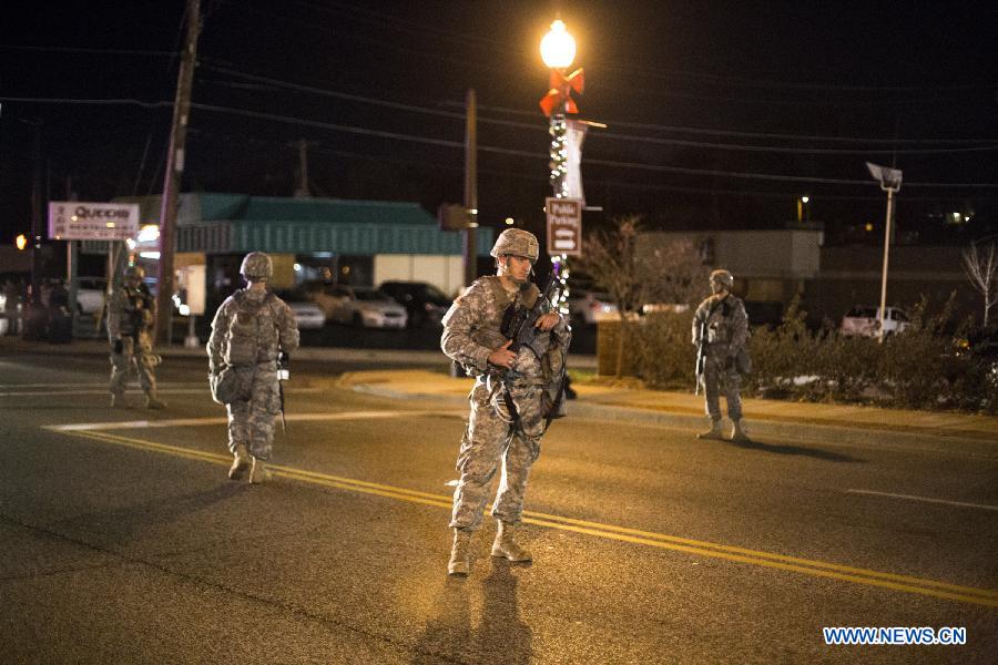 National Guard stand guard north of the Ferguson PD Station as protesters are dispersed and arrested after blocking the street in Ferguson, Missouri, the United States, on Nov. 28, 2014. Police arrested 15 people Friday night as about 100 protesters blocked traffic in front of the local police department in Ferguson. The protest was the latest one in reaction to the non-indictment of police officer Darren Wilson, who shot and killed unarmed 18-year-old black youth Michael Brown in August. (Xinhua/Jim Vondruska)