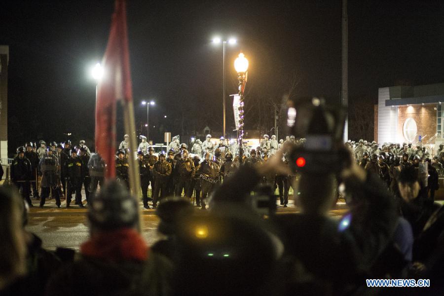 | Protesters use a loud speaker to chant and communicate their views toward National Guard and Police Forces in Ferguson, Missouri, the United States, on Nov. 28, 2014. Police arrested 15 people Friday night as about 100 protesters blocked traffic in front of the local police department in Ferguson. The protest was the latest one in reaction to the non-indictment of police officer Darren Wilson, who shot and killed unarmed 18-year-old black youth Michael Brown in August. (Xinhua/Jim Vondruska) |
