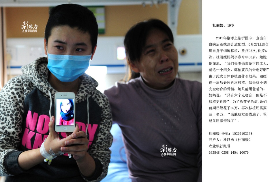 Photos taken before Du Liyuan got ill show she had black hair and big bright eyes. Her hair has been lost for two times due to chemotherapy. "I owe so much to my parents. They only have one child. I am determined to earn more money to take care of them," says Du.