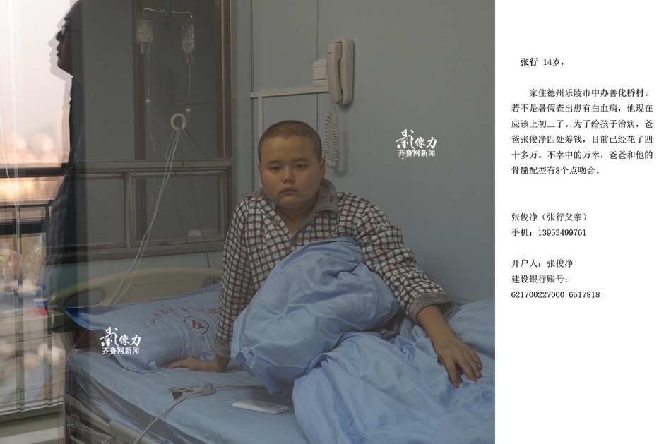 Zhang Xing, 14, would be at junior school if he had not been diagnosed with leukemia in summer vacation. Fortunately, Zhang's father's marrow highly matches his. In light of his family situation and his illness, his father Zhang Junjing tries every means to raise money. Zhang's illness cost his family more than 40,000 yuan. In the ward, only Zhang's uncle was there and his father returned home to borrow money.