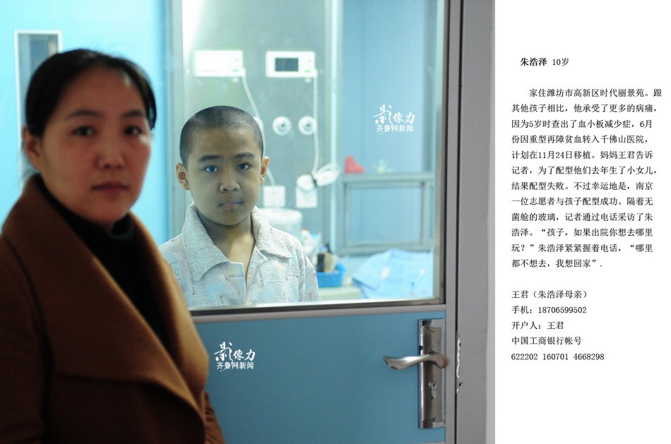 To help 10-year-old Zhu Haoze suffering from Leukemia, his mother Wang Jun gave birth to a girl last year. But the marrow of the two children did not match. Fortunately, a volunteer from Nanjing is able to donate marrow for Zhu. When asked about what he would do when he were back to normal, Zhu said: "I want to go home."