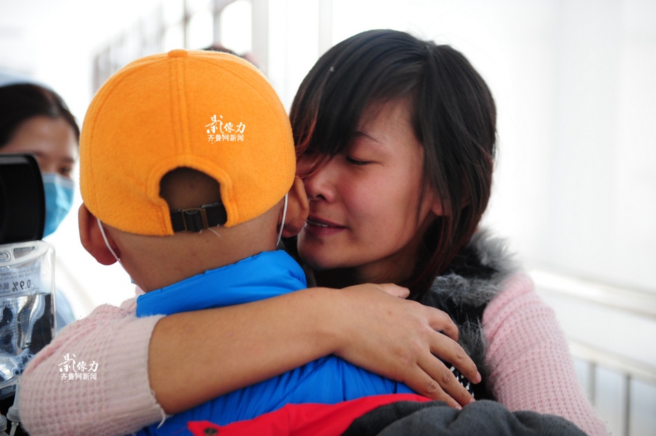 Gao caught on high fever in February 2014 and then he was diagnosed with leukemia. After local news agencies reported his story, Gao and his family has got donation of around 110,000 yuan. Gao hugs his mother, Yue Jinhua, right after he was set free from sterility cabin. "I am able to touch my mother again," Gao said. (Iqili/Yu Peng, Li Ruiping)
