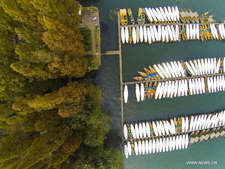 This bird eye view shows trees along a road in the scenic spot of West Lake in Hangzhou, capital of east China's Zhejiang Province, Dec. 1, 2014. (Xinhua/Xu Yu)