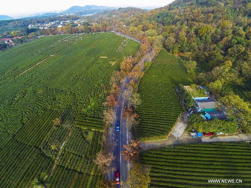 This bird eye view shows trees along a road in the scenic spot of West Lake in Hangzhou, capital of east China's Zhejiang Province, Dec. 1, 2014. (Xinhua/Xu Yu)