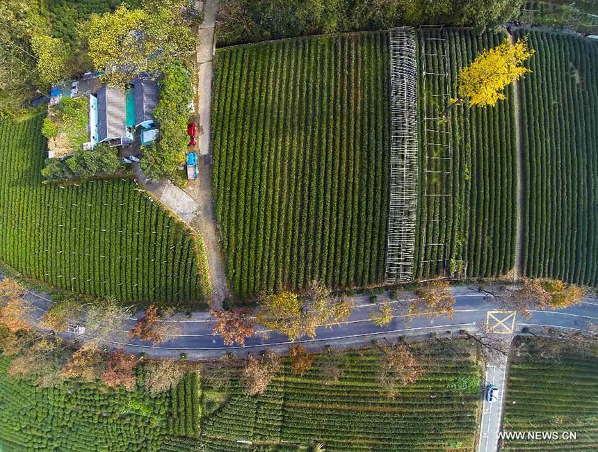 | This bird eye view shows trees along a road in the scenic spot of West Lake in Hangzhou, capital of east China's Zhejiang Province, Dec. 1, 2014. (Xinhua/Xu Yu) |