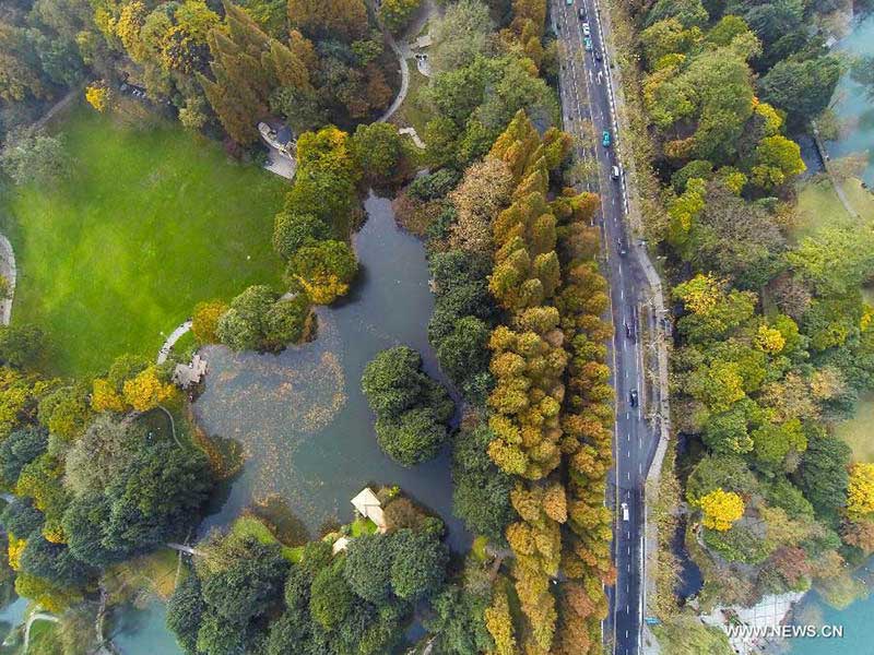 This bird eye view shows trees along a road in the scenic spot of West Lake in Hangzhou, capital of east China's Zhejiang Province, Dec. 1, 2014. (Xinhua/Xu Yu)