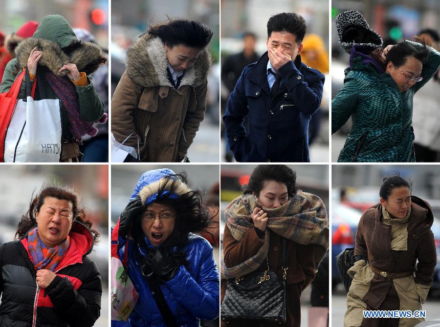 Combined photo taken on Dec. 1, 2014 shows the pedestrians walking on streets in Yantai, east China's Shandong Province. A strong cold front will sweep central and east China, bringing sharp temperature drops on Monday and Tuesday, the National Meteorological Center said on Monday. (Xinhua/Luan Shengjie)