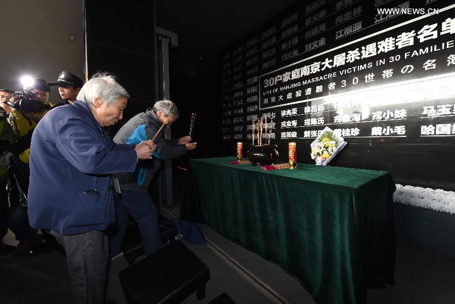| Yang Cuiying (L, front), a survivor of the Nanjing Massacre, mourns her family members in front of a wall with "List of Nanjing Massacre Victims in 30 Families" at the Memorial Hall of the Victims in Nanjing Massacre by Japanese Invaders in Nanjing, capital of east China's Jiangsu Province, Dec. 1, 2014. A series of ceremonies were held by people to mourn their family members killed in the 1937 massacre ahead of the National Memorial Day for Nanjing Massacre Victims, which falls on Dec. 13. (Xinhua/Sun Can) |