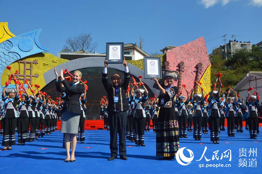 Nearly 10,000 Buyi people (an ethnic group living in south China) in national costumes danced together in Ceheng county, southwest China’s Guizhou province on Nov. 29, 2014. A certifier from the Guinness World Record granted the certificate “Buyi bamboo drum dance and Zhuanchang dance Guinness world record” to this dance after the performance. (Photo source: gz.people.cn)