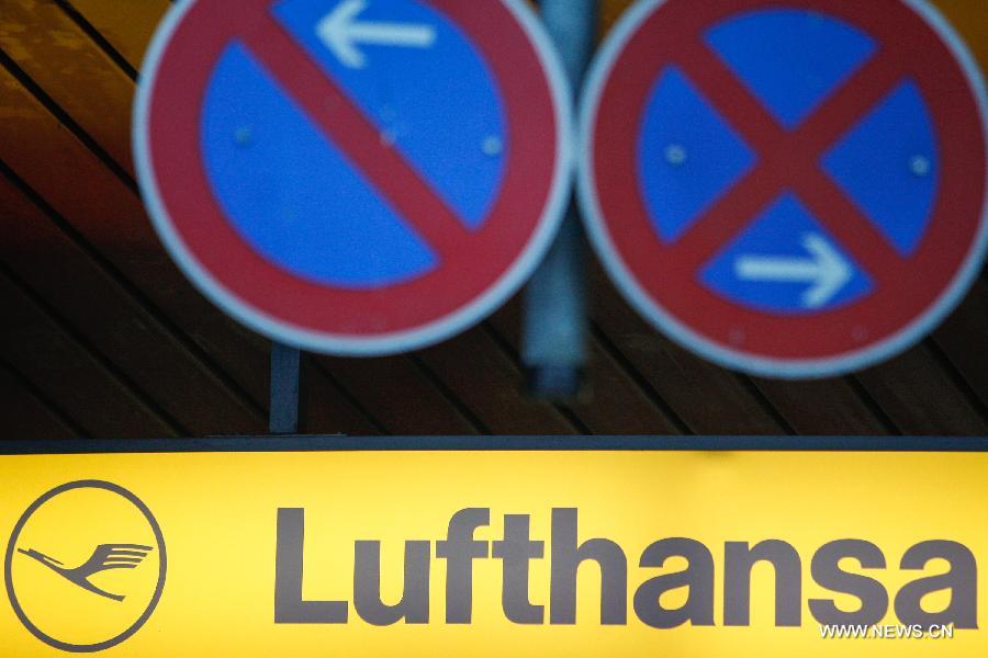 Photo taken on Dec. 1, 2014 shows a board with Lufthansa's logo in Tegel airport, Berlin, Germany. German airline Lufthansa said on Monday that it had canceled nearly half of its scheduled flights on Monday and Tuesday due to a strike by its pilots. (Xinhua/Zhang Fan)
