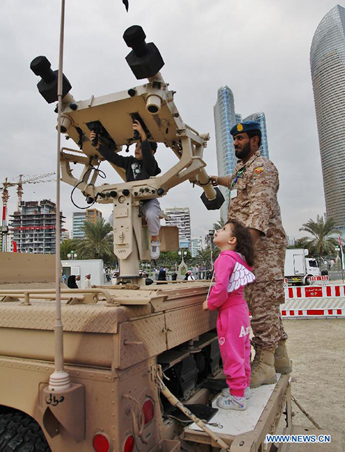A boy operates a military equipment during a defence show to celebrate the 43rd anniversary of the founding of the United Arab Emirates (UAE) in Abu Dhabi, capital of the UAE, on Dec. 1, 2014. The UAE greets its national foundation day on Dec. 2 annualy. (Xinhua/An Jiang)