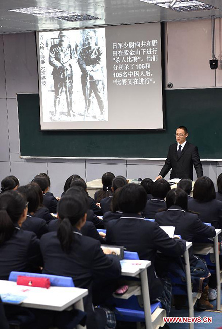 History instructor Fan Shiwen teaches in a course opened in Nanjing No. 1 Middle School in Nanjing, capital of east China's Jiangsu Province, Dec. 2, 2014. Nanjing opened courses Tuesday for students based on the textbooks "Warning and Thinking", "Memory of Blood and Fire" and "Historical Truth" issued on Monday. In February of this year, China's top legislature designated Dec. 13 as the National Memorial Day to mourn the Nanjing Massacre victims and all of those killed by Japanese invaders. (Xinhua/Sun Can)