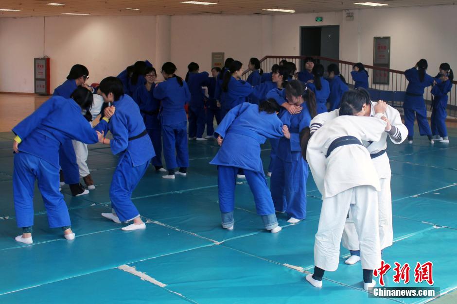 College girls in Zhengzhou University take women's self-defense training. (CNS/Ma Yiheng)