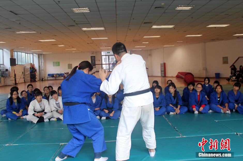 College girls in Zhengzhou University take women's self-defense training. (CNS/Ma Yiheng)