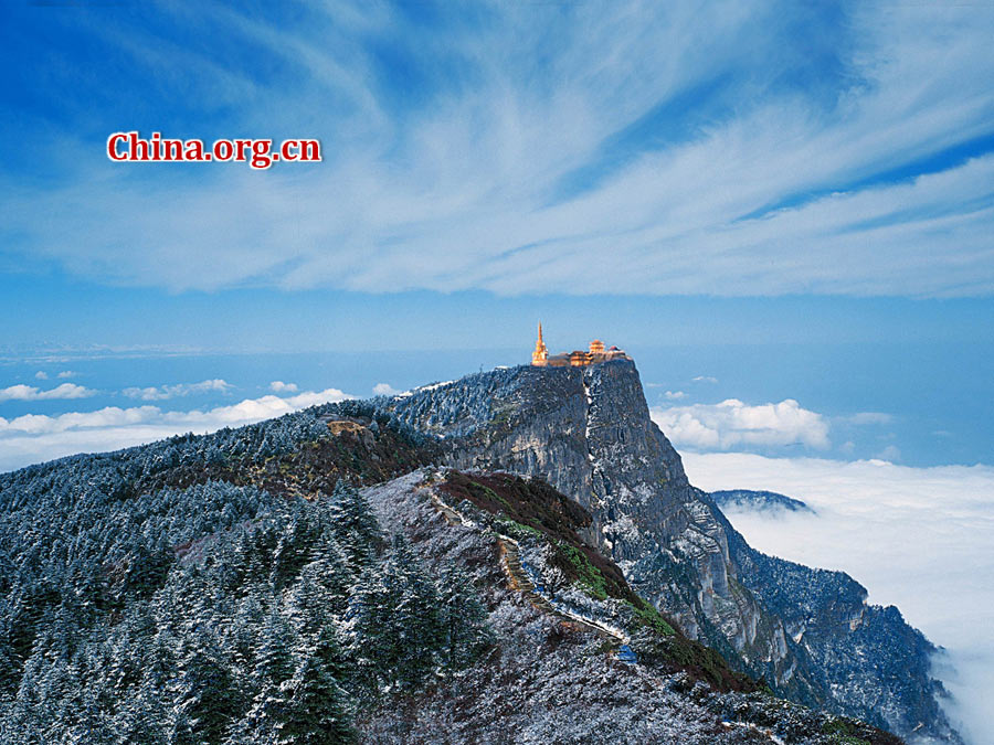 | The Golden Summit is one of four scenic areas at Mt. Emei, a towering, beautiful mountain in central Sichuan province. The Golden Summit, the mountain's main peak at 3,079.3 meters above sea level, seems to almost touch the sky. There are four classic scenes at the Golden Summit: the sea of clouds, the sunrise, the "Buddha rays", and the "saint lamps." [China.org.cn by Zuo Jiang] |