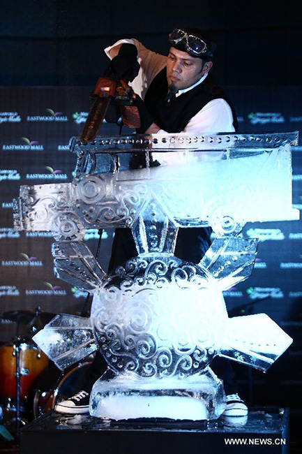 Max Zuleta of Ice Beat Factory uses a chainsaw to create an ice sculpture at a mall in Quezon City, the Philippines, Dec. 3, 2014. Ice Beat Factory mixes music and sculpting in its performances. (Xinhua/Rouelle Umali)