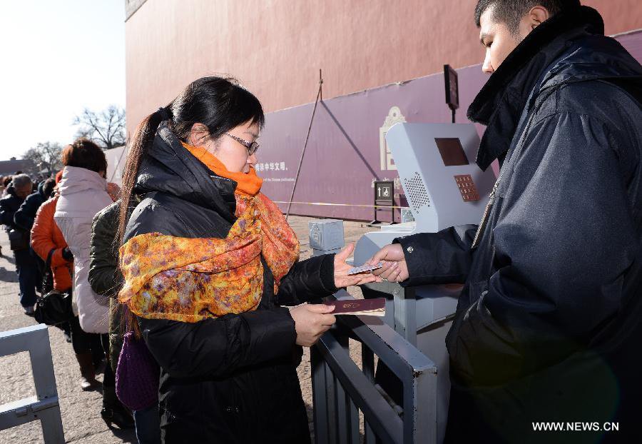 | A visitor has her teacher certificate checked at the entrance to the Palace Museum in Beijing, China, Dec. 3, 2014. The Palace Museum started waiving the entry fee for certain Chinese residents on Wednesday. Chinese teachers, students, soldiers, police, medical staff and volunteers will be able to visit the museum for free on the first Wednesday of each month from December 2014 to April 2015. The initiative aims to foster interest from these key groups of society in the popular ancient Chinese palace during the museum's quieter months, while at the same time reducing the hordes of tourists during high season. (Xinhua/Li He) |