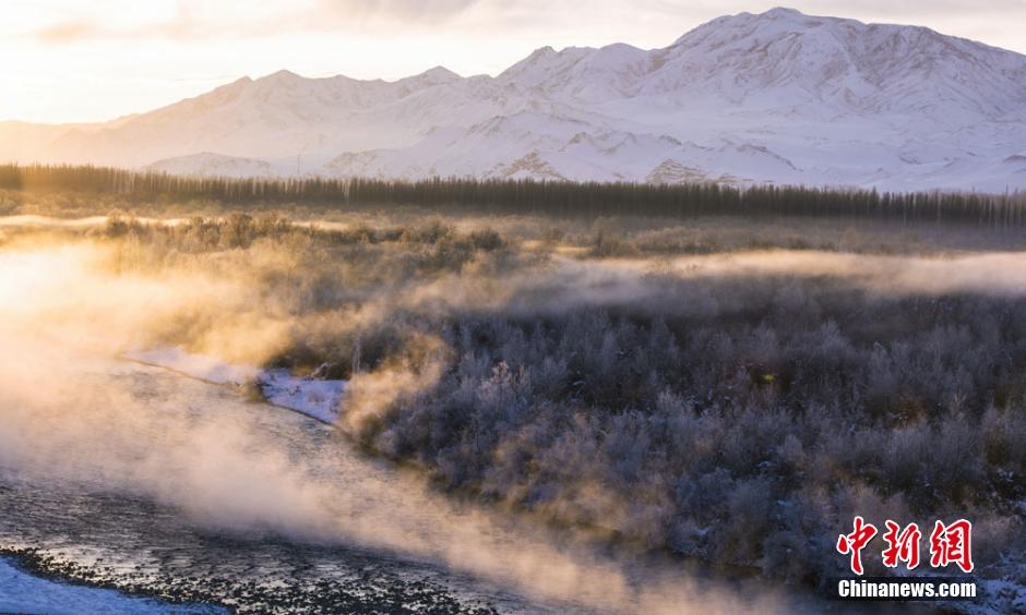 The beautiful secondary forest is shrouded by winter mist at the Kashgar River Valley in Nilka county, northwest China’s Xinjiang Uyghur autonomous region on Dec 1, 2014. With the mist still lingering around, part of the secondary forest sparkles in winter sunshine at the Kashgar River Valley in Nilka county, northwest China’s Xinjiang Uyghur autonomous region. The secondary forest in Nilka, the largest and best-reserved in Asia, covers an area of 210,000 hectares and extends 100 kilometers. The Kashgar River Valley is home to a great diversity of animals and plants. (China News Service/Chen Hualin)