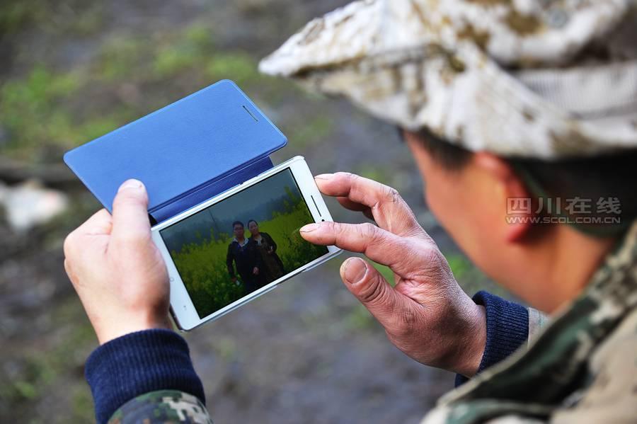 A ranger looks at family photos in the phone.(Photo/SCOL.com.cn)