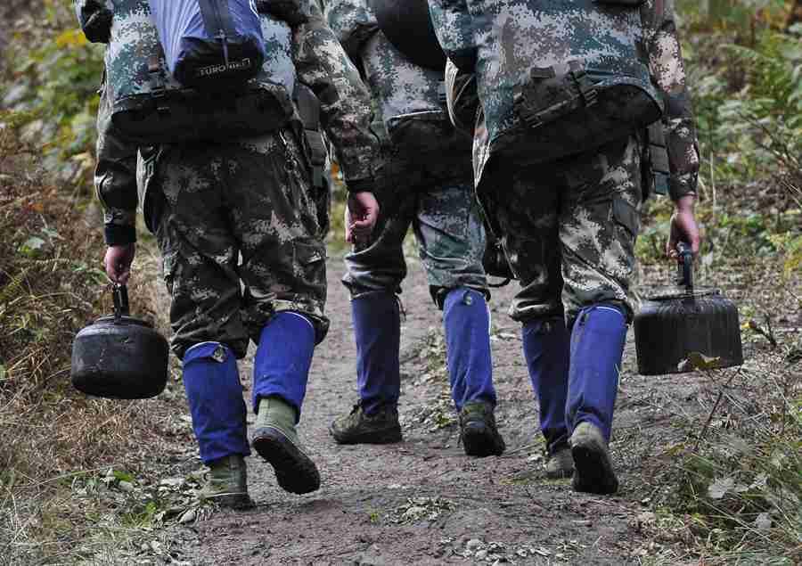 Three rangers loaded with contents of knapsack work their way through the forest.(Photo/SCOL.com.cn)