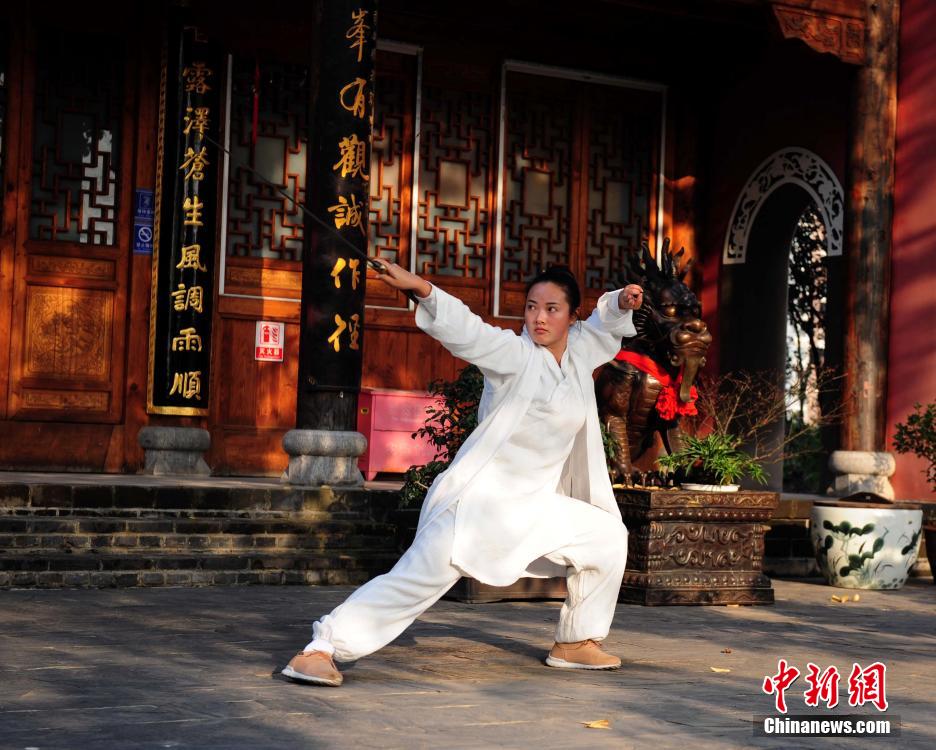 Zhang Lijuan practices shadowboxing, sword dance in Changchun Temple in Wuhan, central China’s Hubei province. She was fascinated by martial art when she was a little girl. (Chinanews.com/Zhang Chang)