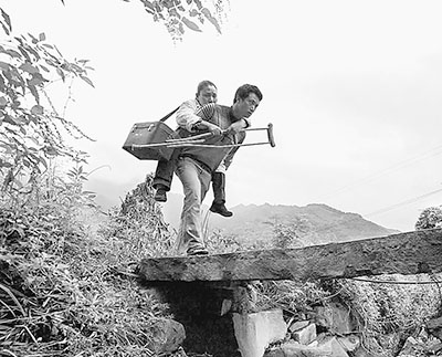 | Ai carries Zhou on his back to see a patient. (Photo/People's Daily) |